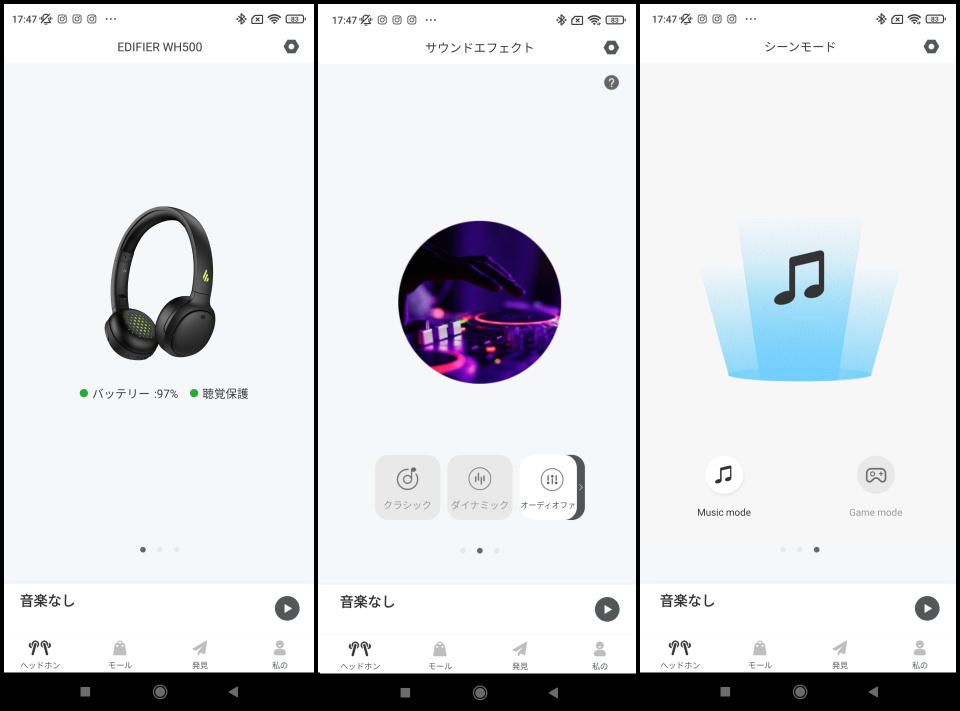 ここからは、専用アプリ「Edifier Connect」を紹介する。スマホにアプリをインストールした後、アプリを起動する。あらかじめヘッドホンとスマホをBluetooth接続しておくとヘッドホンの機種を自動で認識して「EDIFIER WH500」の画面に推移する。この画面は横に移動でき、それぞれ「サウンドエフェクト」「シーンモード」の合計3画面が用意されている。