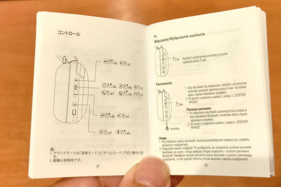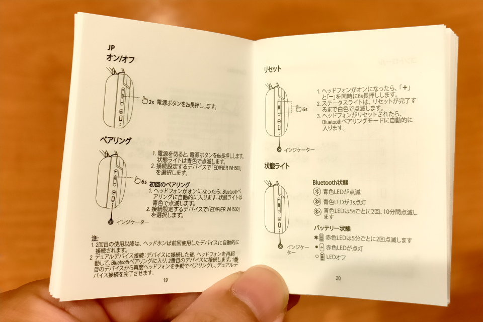 取扱説明書は全83ページのかなり小さな冊子で、多言語で記載されている。日本語を含め1言語あたり3ページだけの説明。日本語ページは19ページから21ページで「オン/オフ」「ペアリング」「リセット」「状態ライト」「コントロール」の5項目について説明されている。冊子自体が小さく、文字のサイズもかなり小さく読みづらい。