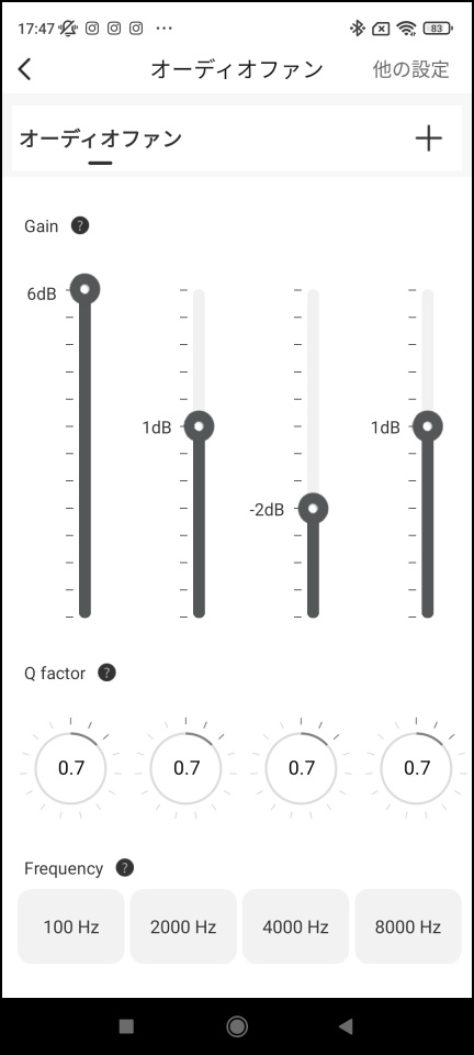 「サウンドエフェクト」画面で「オーディオファン」のアイコンをタップするといわゆるイコライザーの画面に推移する。「オーディオファン」の画面では「Gain」「Q factor」「Frequency」の3つの項目を調整して、より自分好みの音質を作り上げることができる。