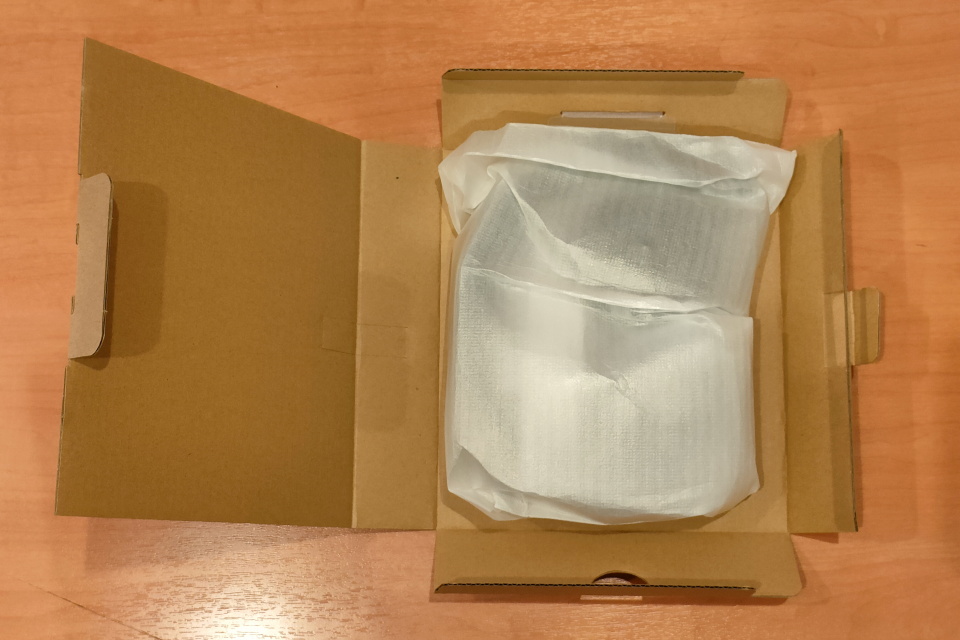 薄いコンパクトな個装箱の裏面には6つの特徴が、日本語を含む5カ国語で、内容物がイラストで記載されている。個装箱の下部を開いて内箱を取り出して内容物を確認する。