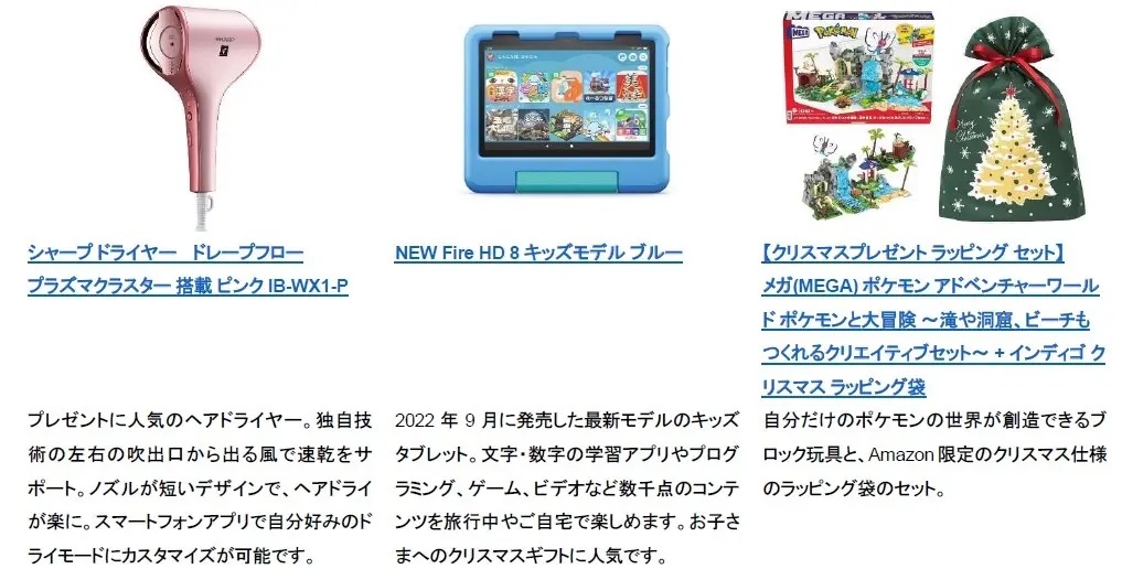 また子供向けのギフトセットにおいてはAmazon限定のラッピング袋などを用意しており、さらに子供向けの人気商品とギフトラッピングのセット販売も行っているため、欲しい商品や贈りたい商品を希望に合わせて探すことができるようになっています。なお、現時点でクリスマスギフト2022において「シャープ ドライヤー ドレープフロー プラズマクラスター 搭載 ピンク IB-WX1-P」や「NEW Fire HD 8 キッズモデル ブルー (8インチ) 数千点のキッズコンテンツが1年間使い放題」、「メガ ポケモン アドベンチャーワールド ポケモンと大冒険 ~滝や洞窟、ビーチもつくれるクリエイティブセット」などが人気の商品となっているとのこと。
