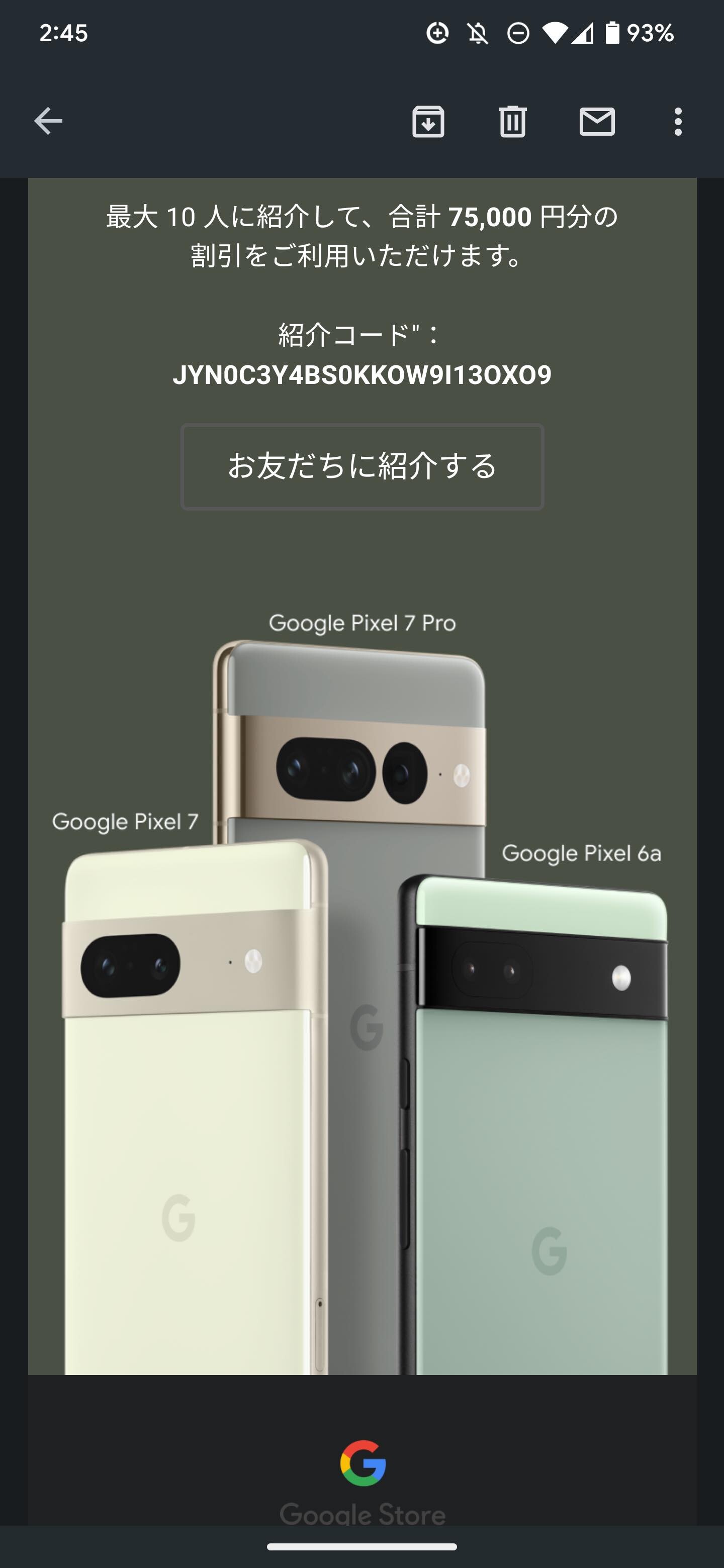 下記のコードを使ってお友だちが Google Pixel 6a、Google Pixel 7、または Google Pixel 7 Pro を購入された場合、ご紹介いただいたお客様とお友だちのお二人に次回の Google ストアでのお買い物の際に商品を 7,500 円引きで購入できる特典を差し上げます。