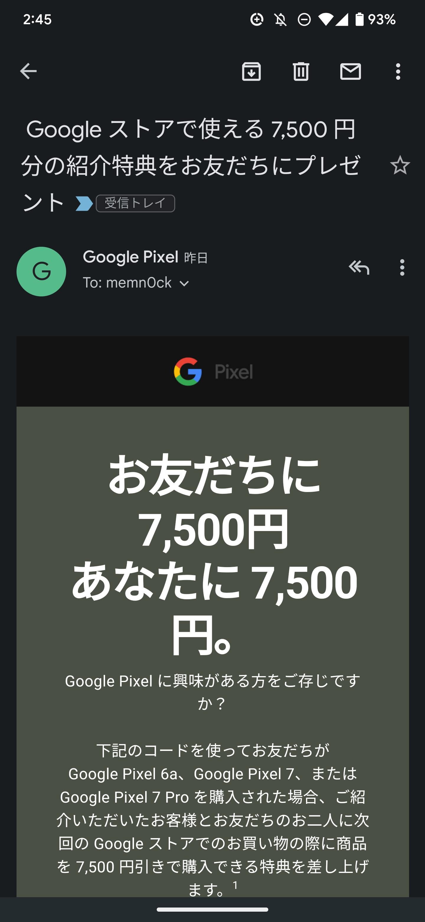 対象製品は5G対応スマートフォン(スマホ)「Pixel 7」および「Pixel 7 Pro」、「Pixel 6a」(ともにGoogle製)となっており、紹介コードの配布条件は明らかにされていませんが、これまでにPixel 7やPixel 7 Pro、Pixel 6aを購入した人だと見られ、対象者には「Google ストアで使える 7,500 円分の紹介特典をお友だちにプレゼント」というタイトルのメールで紹介コードが送られています。