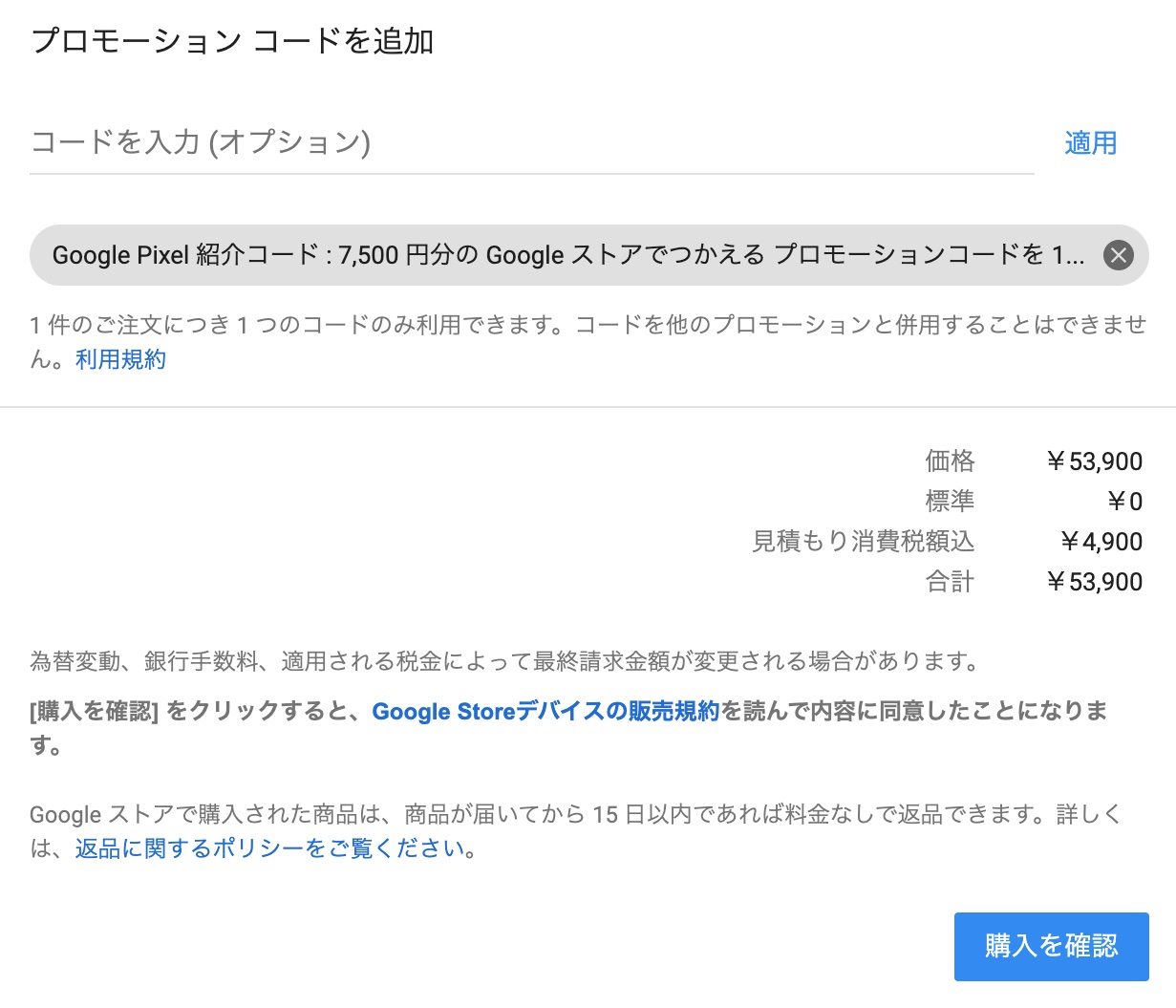 Google ストアで 7,500 円引き: プロモーション コードを利用するには store.google.com にアクセスして商品をカートに追加し、ご購入お手続き時にプロモーション コードを入力してください。Google ストアでのご注文が 7,500 円引きになります。7,500 円の割引はご購入手続きの際に適用されます。プロモーション コードの有効期限は 2023 年 9 月 30 日です。期限までにご利用ください。紹介コードの発行はお客様 1 人につき 10 回まで、プロモーション コードの発行は 1 つの紹介コードにつき 1 回のみです。