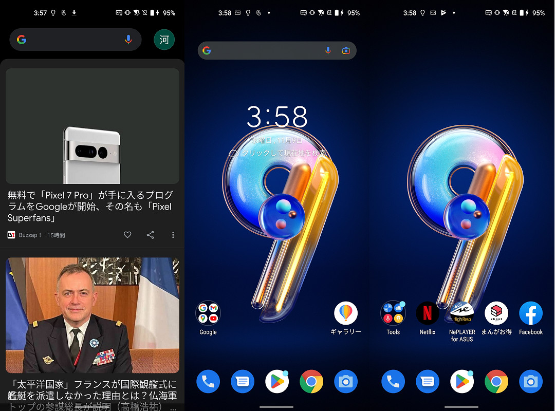 続いて初期設定直後のホーム画面やプリインストールアプリを紹介していきます。Zenfone 9のホーム画面は左にある「Google Discover」を含めた全3面で、中央のホーム画面にはGmailやGoogleマップ、ChromeなどのAndroidスマホではお馴染みのGoogle製のアプリがまとめられたフォルダーとエイスースの画像ギャラリーアプリがあるのみで、右のページにはNetflixやFacebookなどのサードパーティー製アプリが個別に置かれていました。