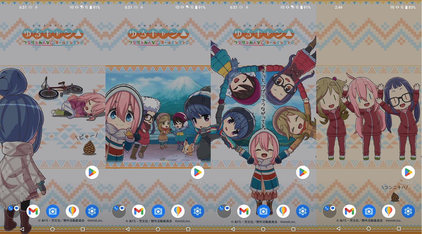 またZenfone 9はアニメ「ゆるキャン△」のゲームアプリ「ゆるキャン△つなげるみんなのオールインワン!!」(2022年秋に配信予定)とのコラボがされており、4種類のゆるキャン△コラボの壁紙がプリインストールされています。せっかくならZenfone 9本体もオリジナルコラボモデルを発売して欲しいところですが、こういうちょっとしたオマケ的なコラボコンテンツも嬉しいものです。