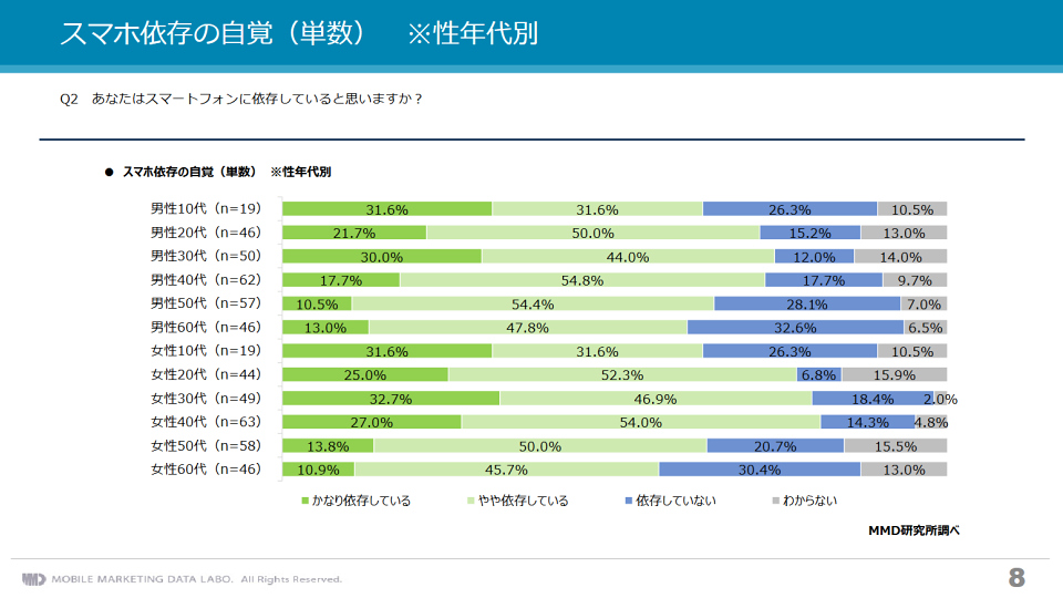 また、「わからない」と答えた人の割合を見る限り、前述のようにスマホが日用品として当たり前の存在になり依存状態にあることを自覚していない人が、10代~30代の男性と10代~20代の女性に多いのではないかという推察も立てられます。