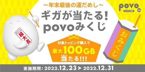 KDDIと沖縄セルラー電話は22日、オンライン専用の料金プランとして提供している携帯電話サービス「povo2.0」( https://povo.jp/ )において対象のトッピングを購入すると抽選で最大100GBが当たるキャンペーン「~年末最後の運だめし~ギガが当たる!povoみくじ」を2022年12月23日(金)0時から12月31日(土)23時59分まで実施するとお知らせしています。
