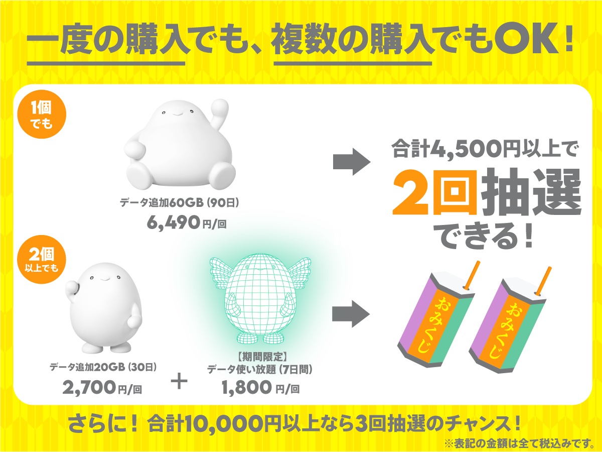 特典は超大吉が「データボーナス100GB(データボーナス20GB(30日間)×5回分)」、大吉が「データボーナス10GB(15日間)」、中吉が「データボーナス1GB(3日間)」、ミニ吉が「データボーナス300MB(24時間)」で、超大吉や大吉、中吉、ミニ吉の当選確率は同率ではなく、低い順に超大吉、大吉、中吉、ミニ吉で当選確率が設定されています。