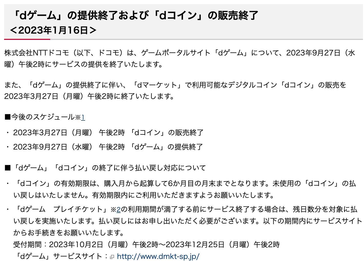 払い戻しには申し出をする必要があり、受付期間内にdゲームのポータルサイト( http://www.dmkt-sp.jp/ )から手続きをするように案内されています。受付期間は2023年10月2日(月)14時から2023年12月25日(月)14時まで。なお、dゲーム プレイチケットはすでに2022年12月26日(月)に新規販売を停止しています。