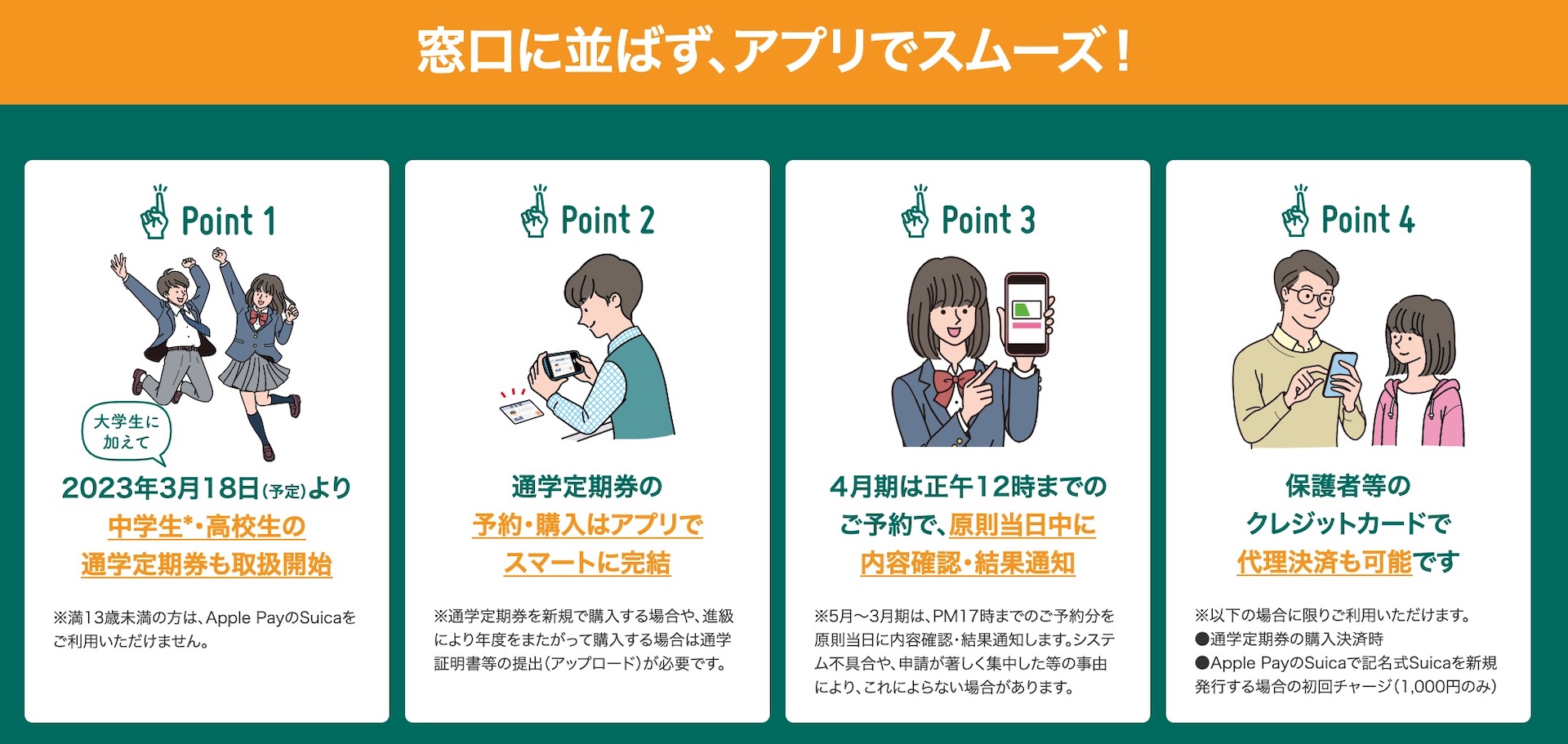 これにより、多くの人が定期券を新規・継続購入する新生活の時期にサービスを拡大させるこで、新年度に向けて定期券窓口に並んでいる中学生・高校生が多いこともあり、モバイルSuicaアプリやPASMOアプリの通学定期券の対応範囲を拡大することで窓口に並ぶことなく購入できるようになり、より利便性が高まるということです。