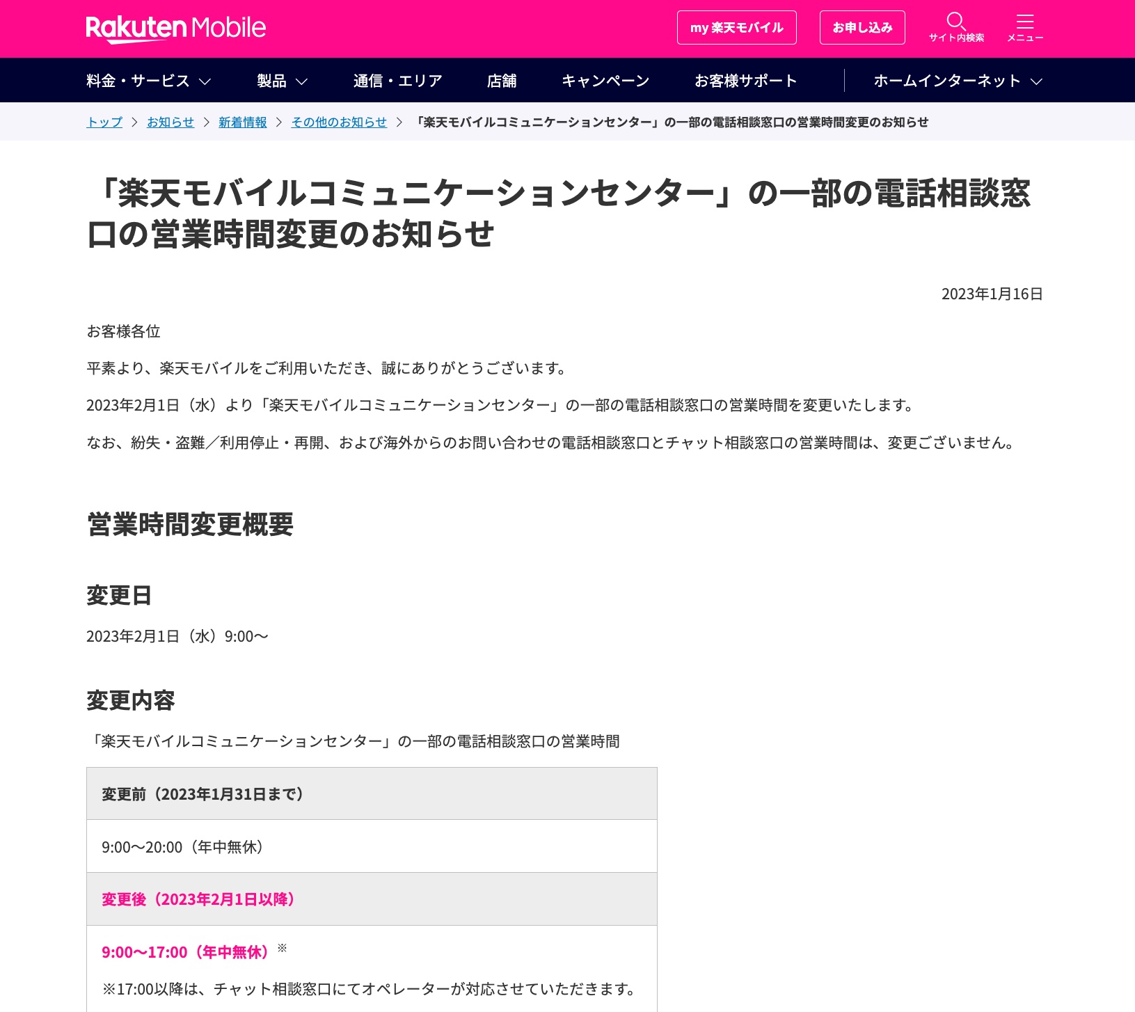 楽天モバイルでは電話によるサポートサービスである楽天モバイルコミュニケーションセンターを大幅に縮小しているようで、公式Webサイトでは電話窓口の案内がかなり少なくなっており、さらに今回は一部の相談窓口については営業時間が17時までに短縮されました。