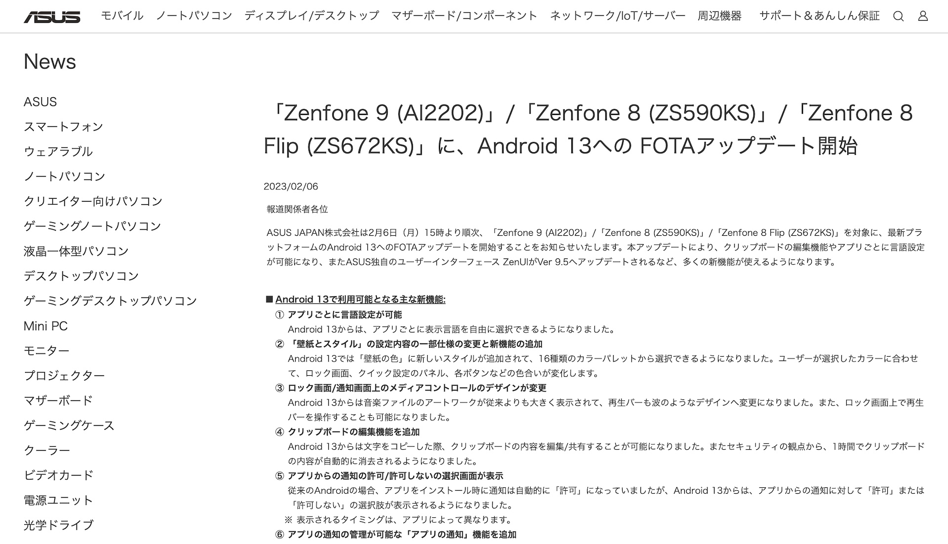 | エイスースがZenfone 9やZenfone8、Zenfone 8 FlipにAndroid 13を提供開始! |