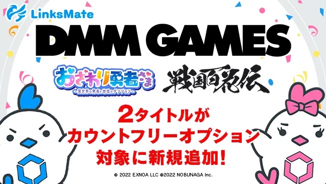 その他、同社ではLinksMateのカウントフリーオプションの対象にEXNOAが提供するオンラインゲームプラットフォーム「DMM GAMES」において配信中の「おさわり勇者さま」(配信元:EXNOA)および「戦国百花伝」(配信元:ノブナガ)を新たに追加すると案内しています。すべてのカウントフリーオプションの対象コンテンツは公式Webページ( https://linksmate.jp/about/countfree/ )をご確認ください。