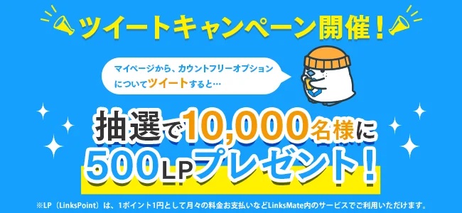 またLinksMateのマイページからカウントフリーオプションを紹介する投稿をTwitterにて行った人の中から抽選で合計1万人に500LPをプレゼントするキャンペーンを実施し、応募期間は2023年2月7日(火)〜2023年11月30日(木)18:00までの10カ月間となっており、期間は毎月の全10回に分けられてそれぞれ1000人が当選されるということです。