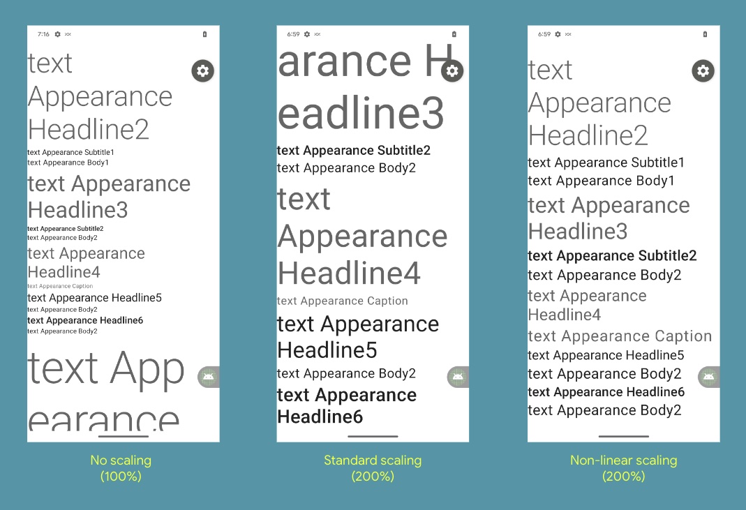 Android 14以降ではフォントを200%に拡大できます。以前はPixelデバイスの最大フォントサイズスケールは130%でした。またテキストが大きくなりすぎる問題を軽減するためにAndroid 14以降では非線形のフォントスケーリングカーブが自動的に適用されます。これにより、すでに十分な大きさのテキストが小さいテキストと同じ割合で増加することはありません。