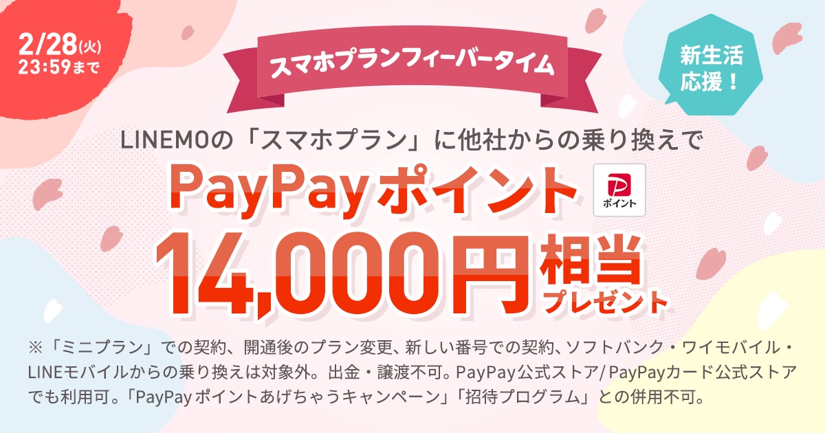 ソフトバンクは22日、オンライン専用の携帯電話ブランド「LINEMO(ラインモ)」において2023年2月22日(水)12:00から2月28日(火)23:59までの期間限定で料金プラン「スマホプラン」を他社から乗り換え(MNP)で申し込むと14,000円相当のPayPayポイントをプレゼントするキャンペーン「新生活応援!スマホプランフィーバータイム」を実施するとお知らせしています。