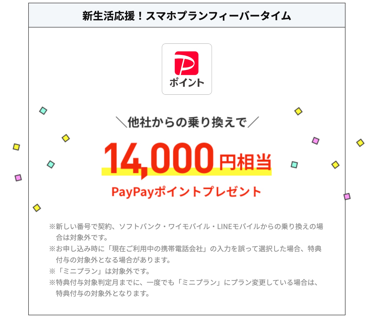 キャンペーン期間中にキャンペーンWebページを経由してLINEMOのスマホプランにMNPで契約した場合にPayPayポイントを14,000円相当プレゼントします。なお、MNPには携帯電話サービス「SoftBank」や「Y!mobile」、「LINEモバイル」からの番号移行はキャンペーン対象外なのでご注意ください。