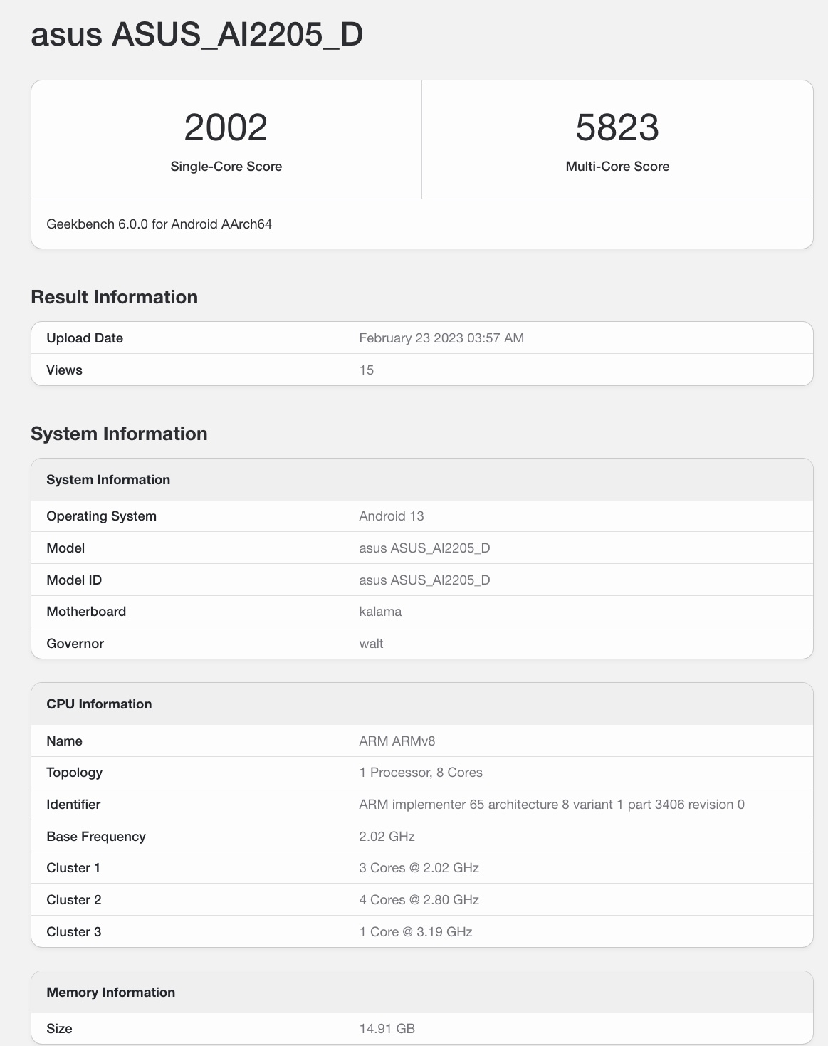 また型番「AI2205」はベンチマークアプリ「Geekbench」の結果も「ASUS_AI2205_B」および「ASUS_AI2205_C」、「ASUS_AI2205_D」として多数掲載されており、掲載情報から「Motherboard」が「kalama」となっているため、チップセット(SoC)にはQualcomm製「Snadpdragon 8 Gen 2」と搭載していると見られます。