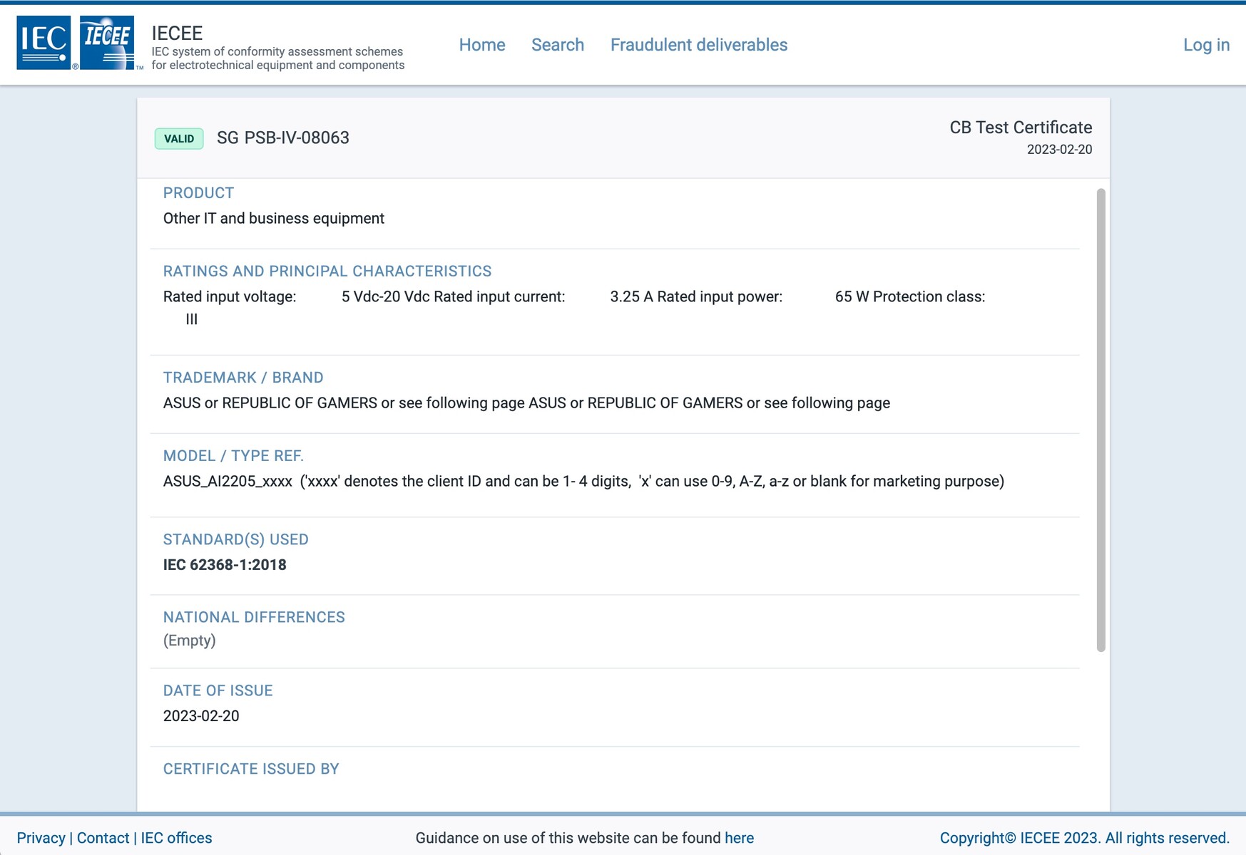 IEC(国際電気標準会議)の電気機器安全規格適合試験制度を運営するIECEEにてフィンランドの各種の分野における第3者認証機関「TÜV SÜD(テュフズード)」の検査をASUSTeK Computer(以下、ASUS)の未発表な製品「ASUS_AI2205_xxxx」が2023年2月20日付で通過したことが公開されています。認証番号は「SG PSB-IV-08063」。