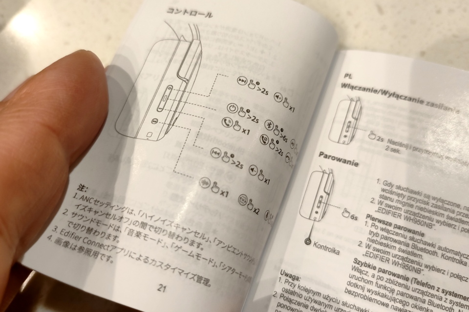 取扱説明書は全82ページのかなり小さな冊子で、多言語で記載されている。日本語を含め1言語あたり3ページだけの説明となっており、日本語ページは19ページから21ページで「オン/オフ」「ペアリング」「リセット」「状態ライト」「コントロール」の5項目について説明されている。