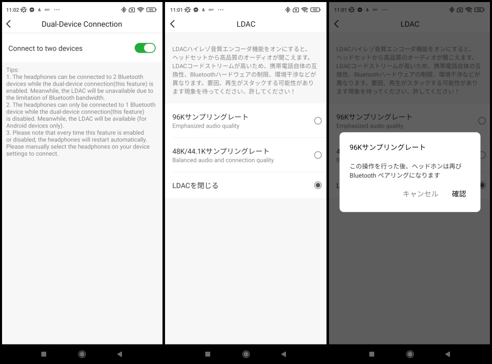その後、「設定」画面の「LDAC」をタップして「96Kサンプリングレート」もしくは「48K/44.1Kサンプリングレート」を選択してオンの状態にする。ここで、「この操作を行った後、ヘッドホンは再びBluetoothペアリングになります」が表示されるので「確認」をタップする。一度、ペアリング操作をやり直すことになるが、この操作が完了すると自動的にLDACで接続される。
