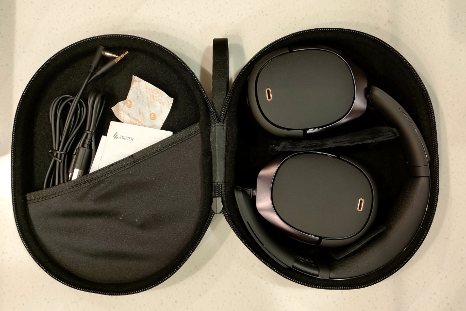 以前紹介した「Edifier WH500」を含め、Edifierの製品群において比較的安価なヘッドホンには専用ポーチが同梱されていない。Edifier WH950NBに同梱されているポーチは、質感もよくしっかりとした作りだ。内面のポケットに小物を収納でき、持ち歩きだけでなく、しばらく利用しない際の収納に困らないのも良い点だ。