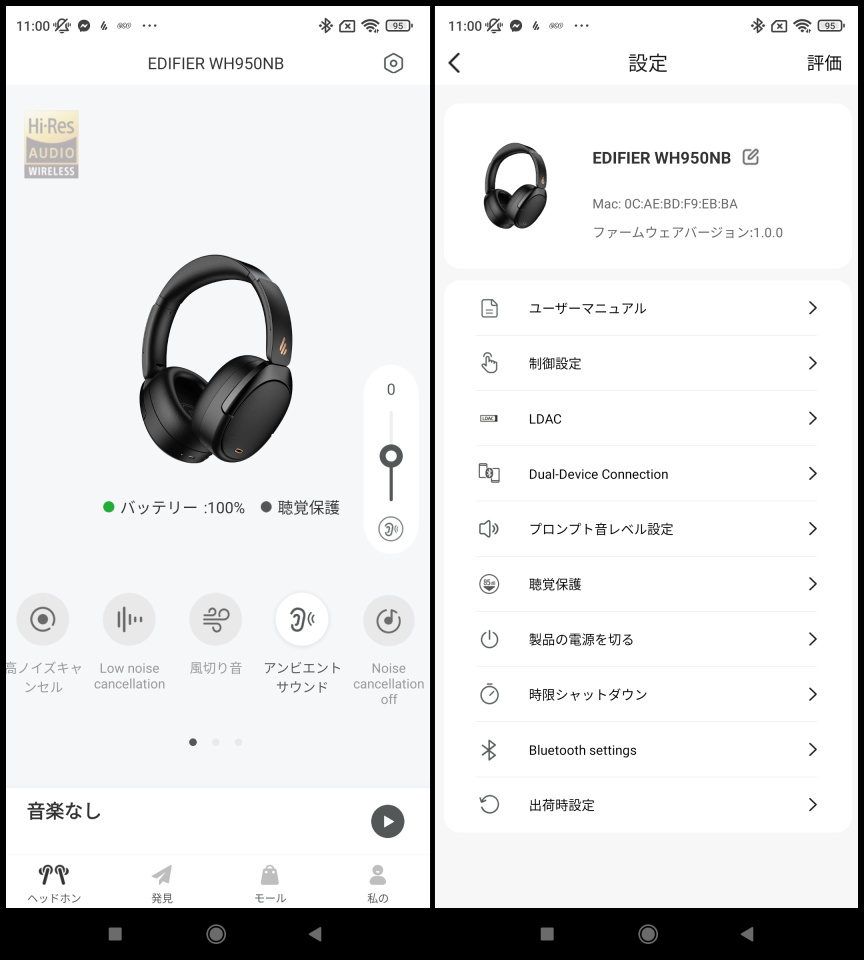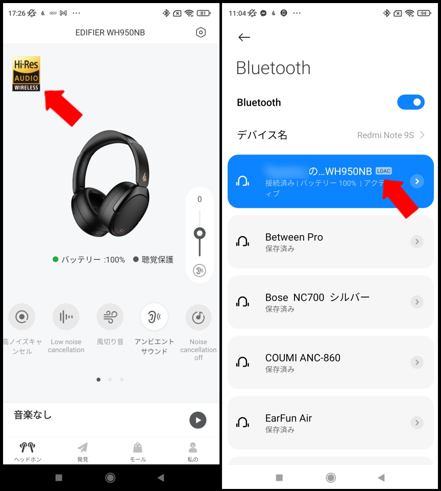 LDACでの接続が有効になると、「EDIFIER WH950NB」の画面左上にあるグレーアウトしていた「ハイレゾオーディオ」のロゴマークが、きちんとカラー表示される。この画面において、LDACがアクティブがどうかが確認できるほか、スマホのBluetoothの設定画面でも「LDAC」が有効であることを確認できる。