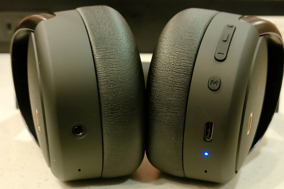 右側のイヤーカップ側面には、電源ボタン、「+」「-」のボリューボタン、「M」ボタンの他、充電用のUSB Type-C端子とLEDインジケーターを搭載する。電源ボタンは長押しでオンとオフの切り替えができ、6秒以上の長押しでBluetoothのペアリングモードを起動する。