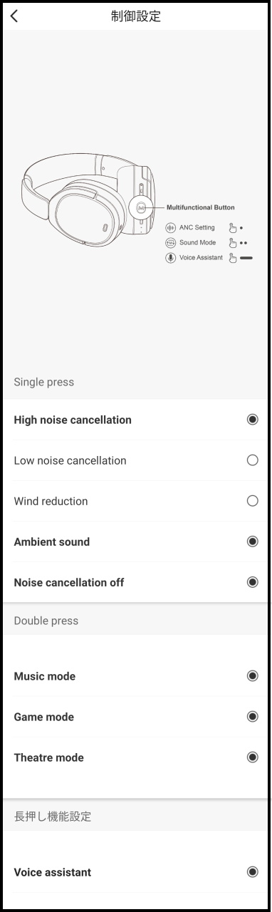 「制御設定」ではキーアサイン(ボタン操作の割り当て)の変更ができる。英語表記だが、「1回押し(短押し)」「2回押し」「長押し」の各操作における動作を選択できる。