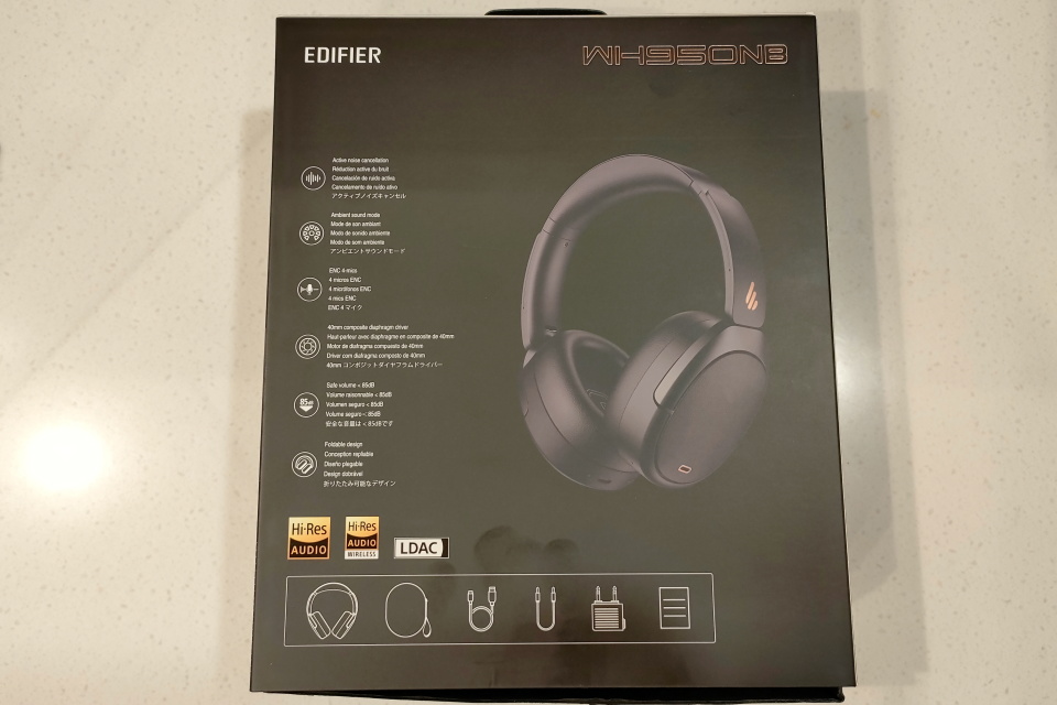Edifier WH950NBの個装箱の裏面には主な特長が日本語を含め5言語で記載されており、日本国内だけでなく海外でも販売されていることが見て取れる。