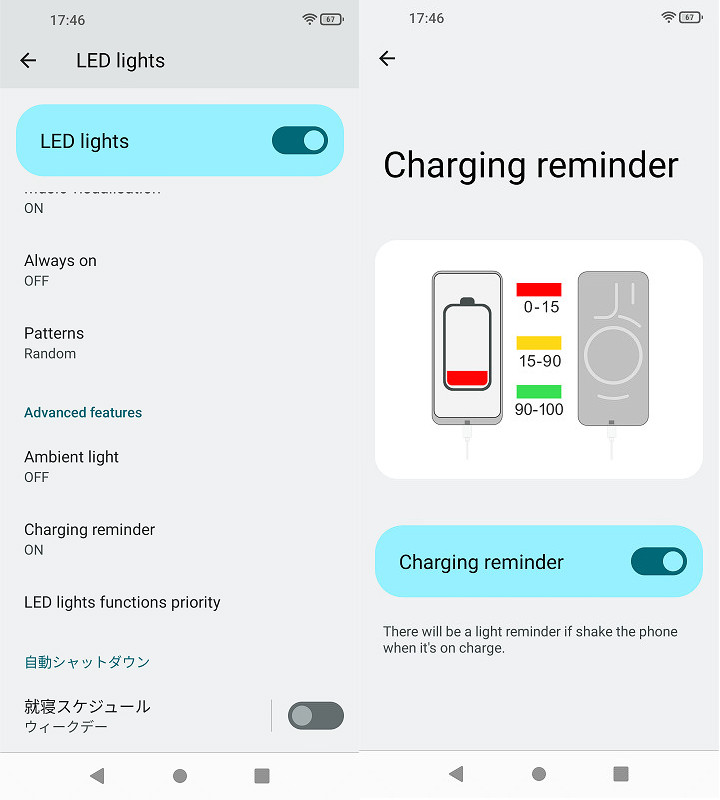 ホーム画面やプリインアプリやシンプルな一方、本機独自の設定項目として設定アプリの中に「LED lights」いう項目があり、ここからイルミネーションLEDの色や点灯パターン、どのタイミングで鳴らせられるようにするかなどの、発光設定をカスタム・変更が可能です。例えば、メインディスプレイが点灯している間は点灯しつづけるようにしたり、着信やメールなどの通知時のみに光るようにしたりといった設定の変更ができます。