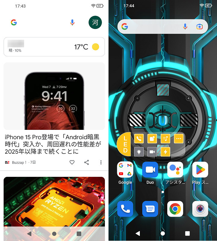 また本機ならではの機能としてイルミネーションLEDを管理するためのウィジェットがある程度で、後はGoogle検索やマップ、GmailなどのGMS(Google Mobile Service)のアプリが置かれています。
