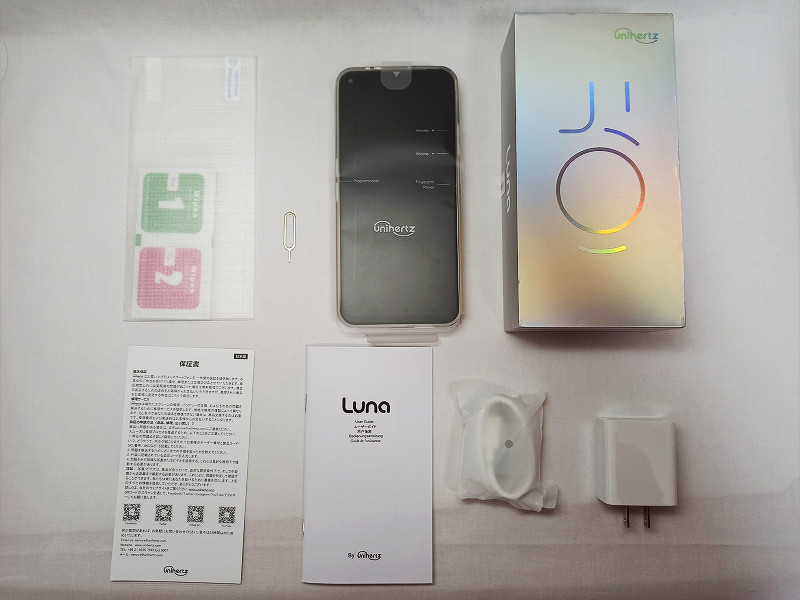 まずは開封して同梱品をチェックしてきます。内容物としてはUnihertz Luna本体のほか、USB(Type-A to Type-C)ケーブルやUSB充電器、TPU製本体カバー(取り付け済み)、画面保護シート、SIMピン、保証書(ワランティカード)、クイックスタートガイドとなっています。