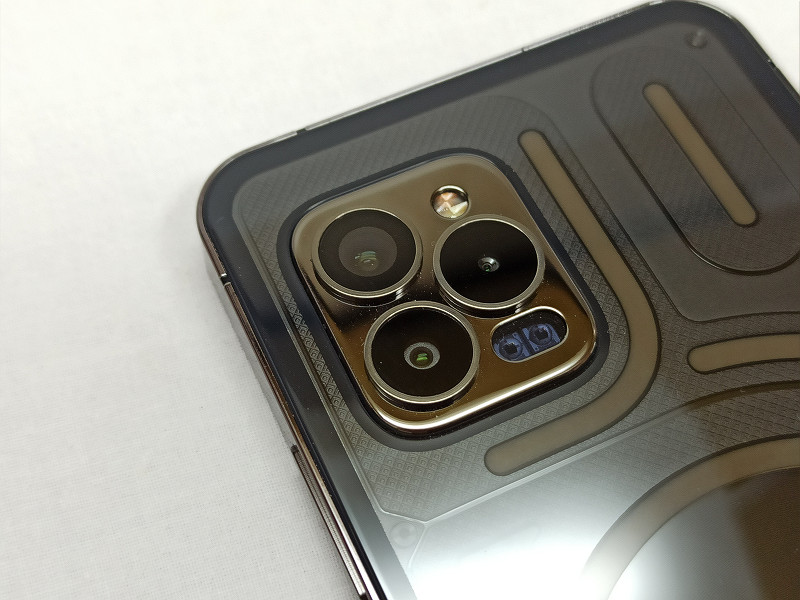 一方、背面側には本機の“肝”とも言える6色点灯可能なLEDライトのほか、以下の3眼構成のリアカメラがあり、さらにカメラユニットの上側には撮影用ライト、カメラユニットの下側にはナイトビジョン撮影用の赤外線ライトが搭載されています。