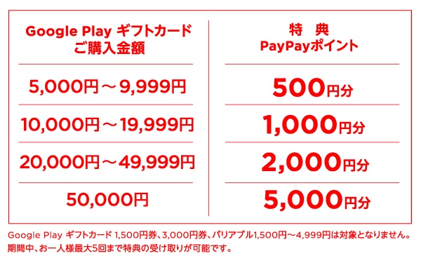 還元はPayPayポイントで行われ、還元ポイントは5,000〜9,999円分購入で500ポイント、10,000〜19,999円分購入で1,000ポイント、20,000〜49,999円分購入で2,000ポイント、50,000円分購入で5,000ポイントとなっており、1人5回まで登録が可能となっているため、還元上限は25,000ポイントとなります。