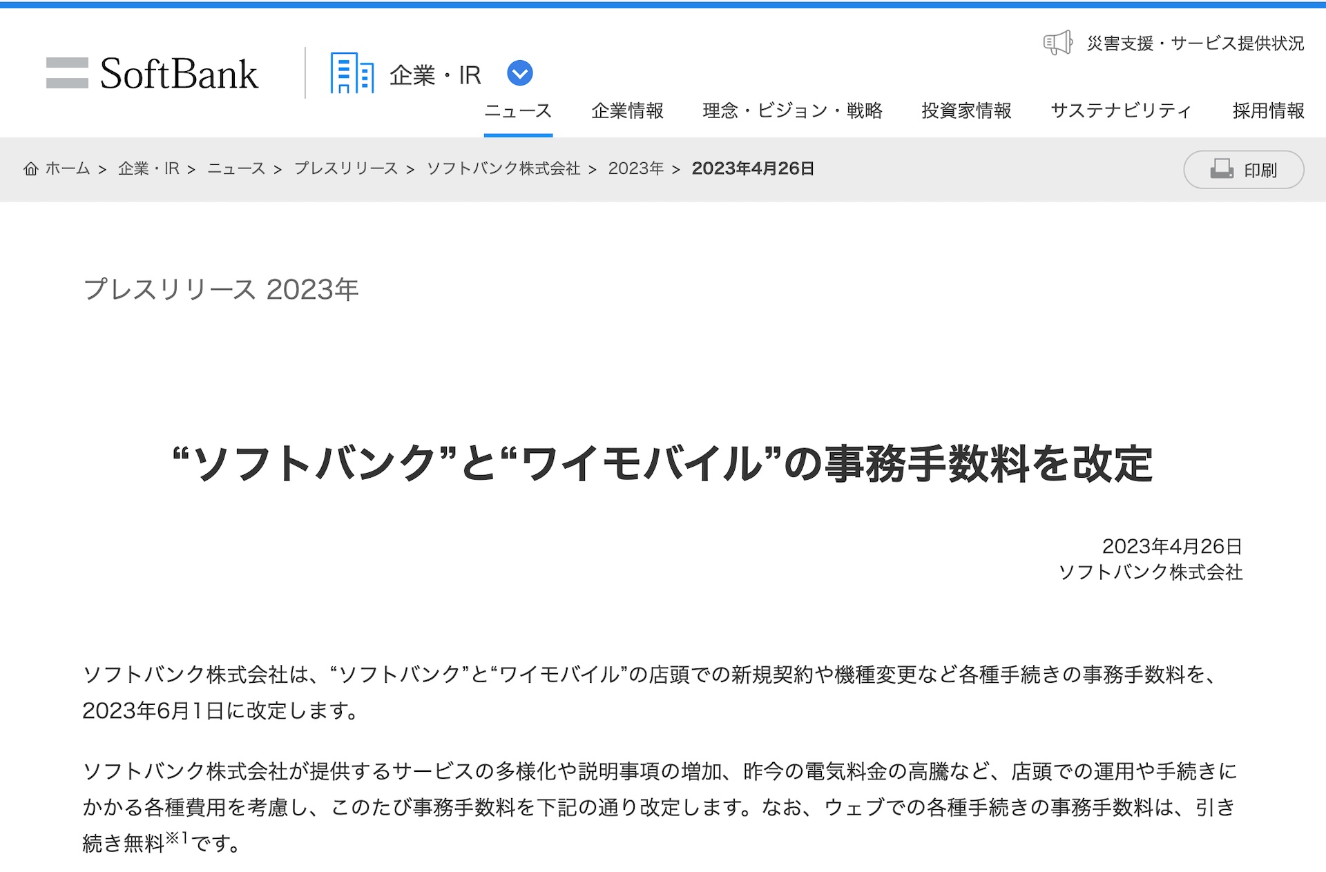 ・“ソフトバンク”と“ワイモバイル”の事務手数料を改定 | 企業・IR | ソフトバンク