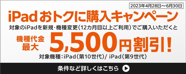 <概要>対象のiPadを新規契約または機種変更で購入の際に機種代金から最大5,500円を割り引きます。