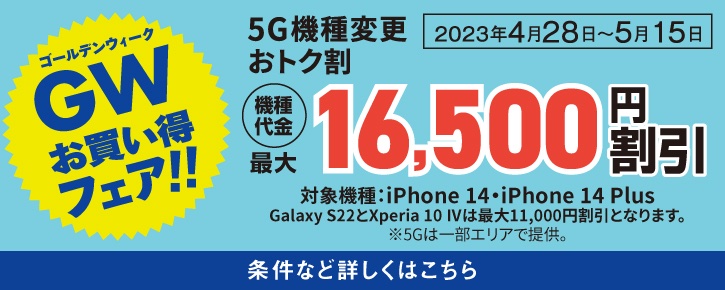 対象機種と割引額は「iPhone 14」および「iPhone 14 Plus」が16,500円OFF、「Galaxy S22 SCG13」および「Xperia 10 IV SOG07」が11,000円OFFとなっており、期間は2023年5月15日(月)まで。なお、条件として直近の購入機種を12カ月目以上使っており、対象料金プランおよび対象の「故障紛失サポート」に新たに加入または継続する必要があります。
