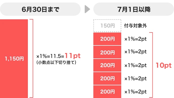 さらに7月1日よりPayPayステップのカウント対象金額と付与ポイント数の計算方法の変更が行われます。変更前と変更後の内容は以下の通り。例えば、付与ポイント数の計算方法変更について支払額1,150円で付与率1%の場合には以下のように6月30日までは小数点切り捨てで11ポイントですが、7月1日からは合計10ポイントとなります。