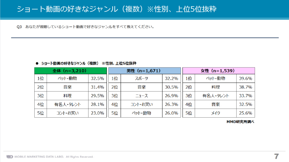 ショート動画で好まれているジャンルを調べてみると、男性の場合はスポーツや音楽への注目度が高く、それにニュース、コント・お笑い、ペット・動物などが続きます。女性の場合、ペット・動物と料理がトップ2で、そこに有名人・タレント、音楽、メイクといった項目が続きます。