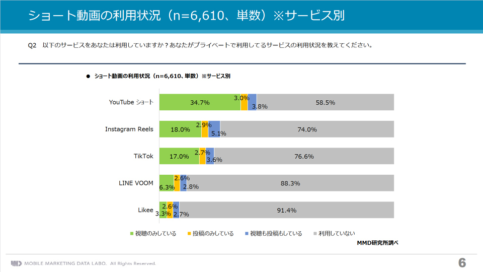 MMD研究所が4月に公開した「ショート動画とコマースに関する調査」によると、ショート動画で最も利用されているサービス(アプリ)は「YouTube ショート」で、「視聴のみしている」という純粋な視聴者の数は34.7%と、3人に1人はYouTube ショートを観ているという調査結果があります。