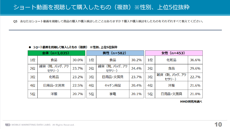 ちなみに「ショート動画を視聴して購入したもの」のランキングを見てみると、男女ともに食品、雑貨、日用品・文房具といった生活に密着したものが購入されており、ここでもやはりテレビメディアやテレビCMとの共通点が見えます。