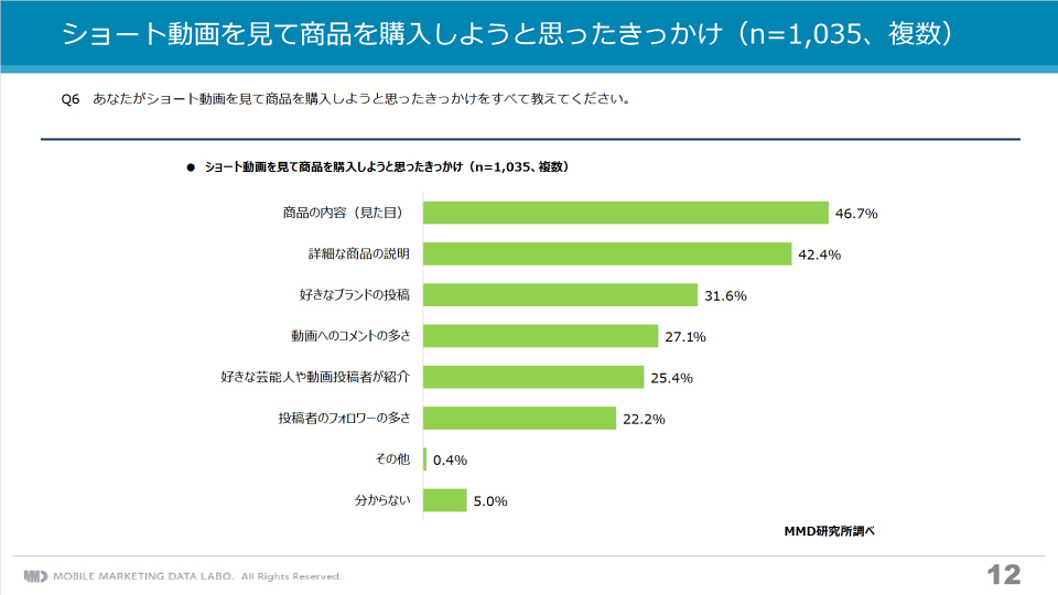 「ショート動画を見て商品を購入しようと思ったきっかけ」という調査結果を見ても、商品の映像や説明といった動画らしい表現手法が評価される中、「動画へのコメントの多さ」といった旧来からの口コミ的な情報を重視する人が27.1%も存在しており、第三者の評価が即座に見られることのメリットが感じられます。