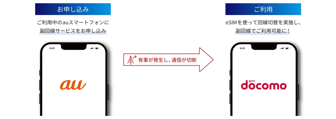 これにより、例えば、通信障害や災害時などにおいても緊急を要する家族や医療機関との音声通話や日常生活に欠かせないスマートフォン(スマホ)などでの決済サービスなどを含めたデータ通信の利用が可能となります。なお、申し込み後に副回線用のSIM(eSIMまたはSIMカード)が発行され、新たな電話番号を利用できるようになります。