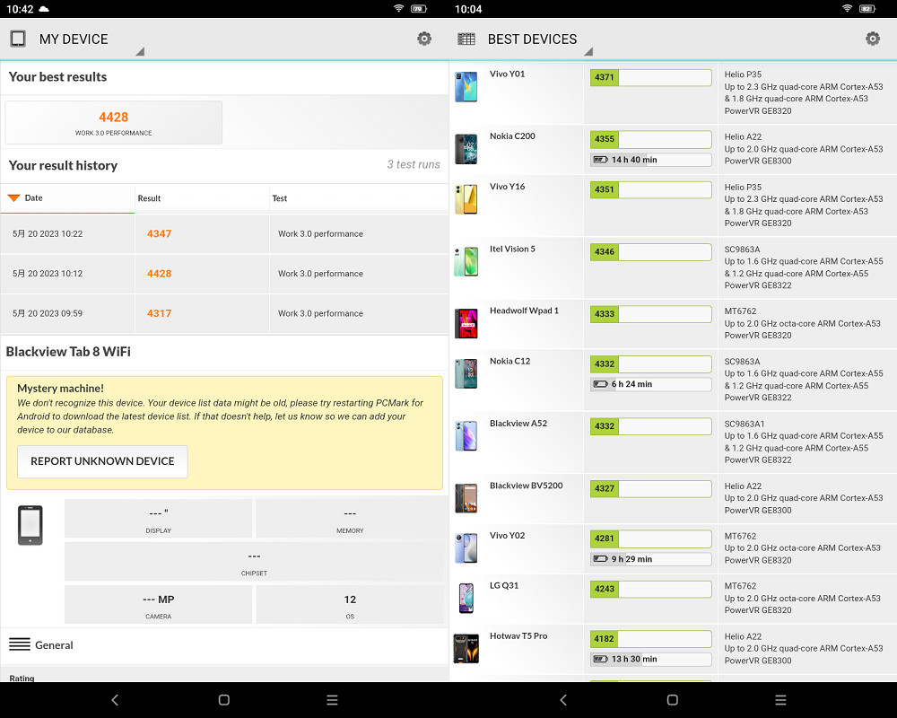 続いて製品の全体的な性能をチェックするベンチマークアプリ「PCmark」を用いてBlackview Tab 8 Wifiのおおまかな性能を確認してみました。計測方法としては3回ベンチマークテストを実行し、その中間値を採用。全体スコアランキング内と比較しておおよその性能をチェックしています。今回の採用スコアは4347点で、SoCがクアッドコアであったり、基本的な動作メモリーが4GB RAMということもあってか、処理速度などの基本的な性能としては決して高くありません。なお、ランキング内の近似値のスコアを見ても日本国内では見かけない端末が並んでいます。一応の参考までに「arrows We」(FCNT製)が6990点なので、基本的な処理能力はお世辞にも高いとは言えないでしょう。