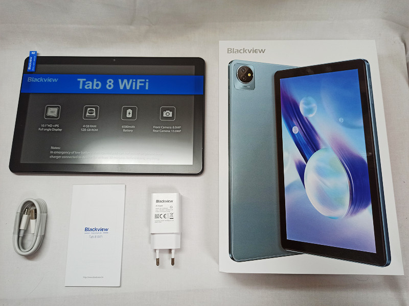 まずはBlackview Tab 8 Wifiの本体とその同梱品をチェックしていきますが、内容物としてはBlackview Tab 8 Wifi本体に加え、マニュアル・USB Type-Cケーブル・USB充電器・ディスプレイ保護フィルム(予め本体へ貼り付け済み)となっています。