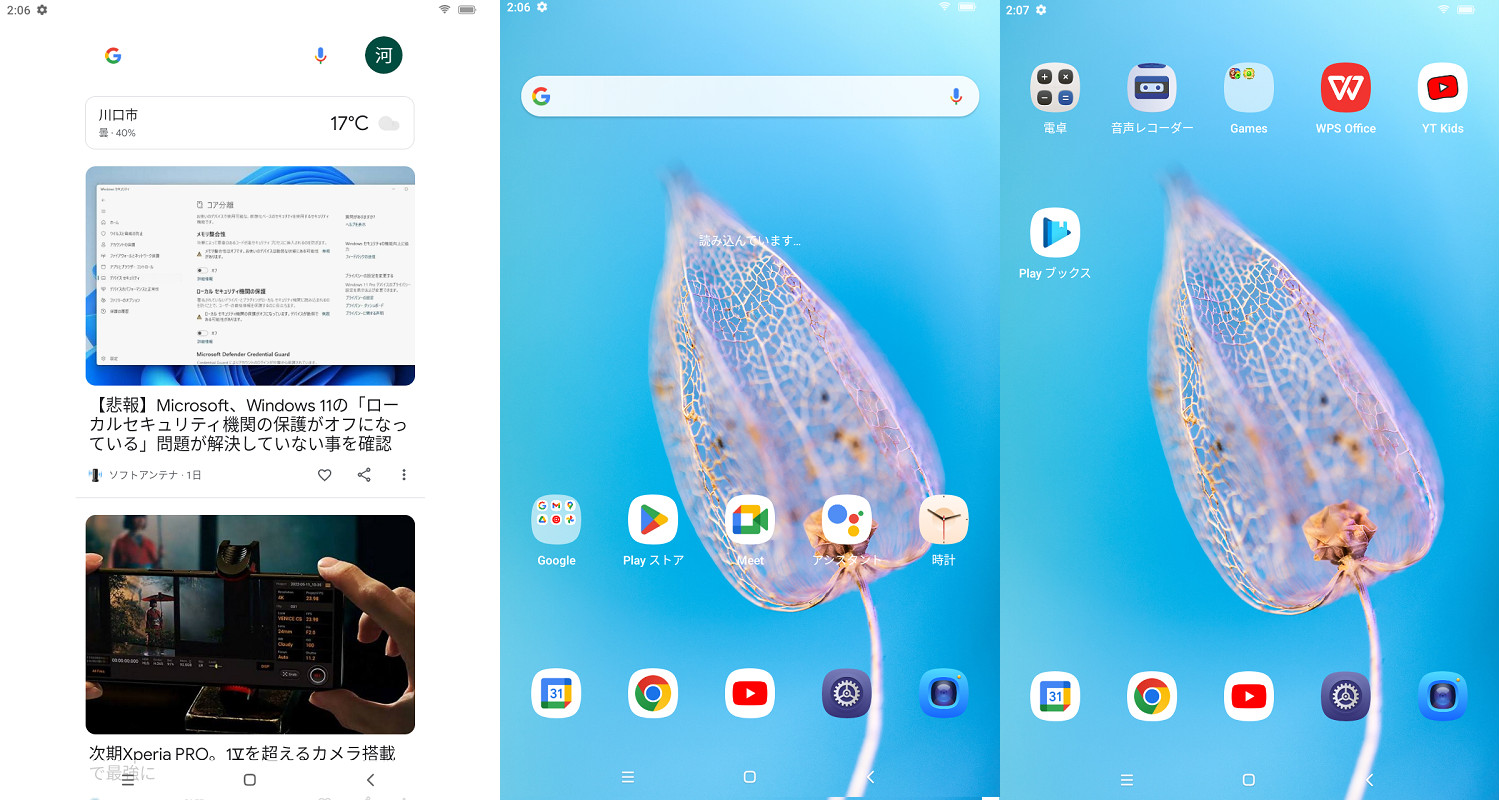 ホーム画面は左側にあるGoogle Discoverとホーム画面2枚の全3枚構成となっています。RAMの節約やSoCへの負担軽減のためにホーム右側に置かれているのアプリを中央へずらして(またはホームから削除)しまってもいいかもしれません。