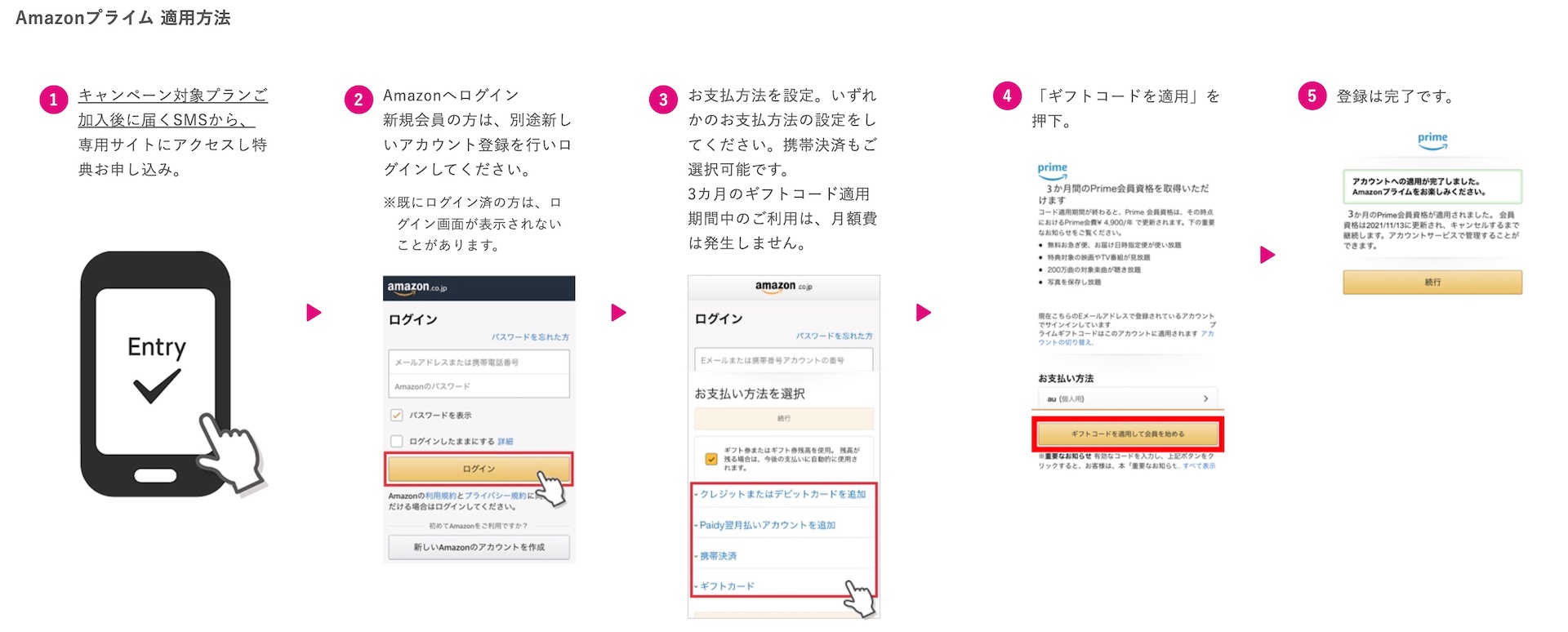 キャンペーンでは対象の料金プランの加入後に届くSMSから専用Webページにアクセスし特典を申し込みます。なお、SMS受信から3カ月以内に記載されている専用URLからAmazon.co.jpのWebサイトで「Amazonプライム」会員規約へ同意の上で利用登録をする必要があり、登録が完了した日から3カ月間は特典が適用されて無料となります。