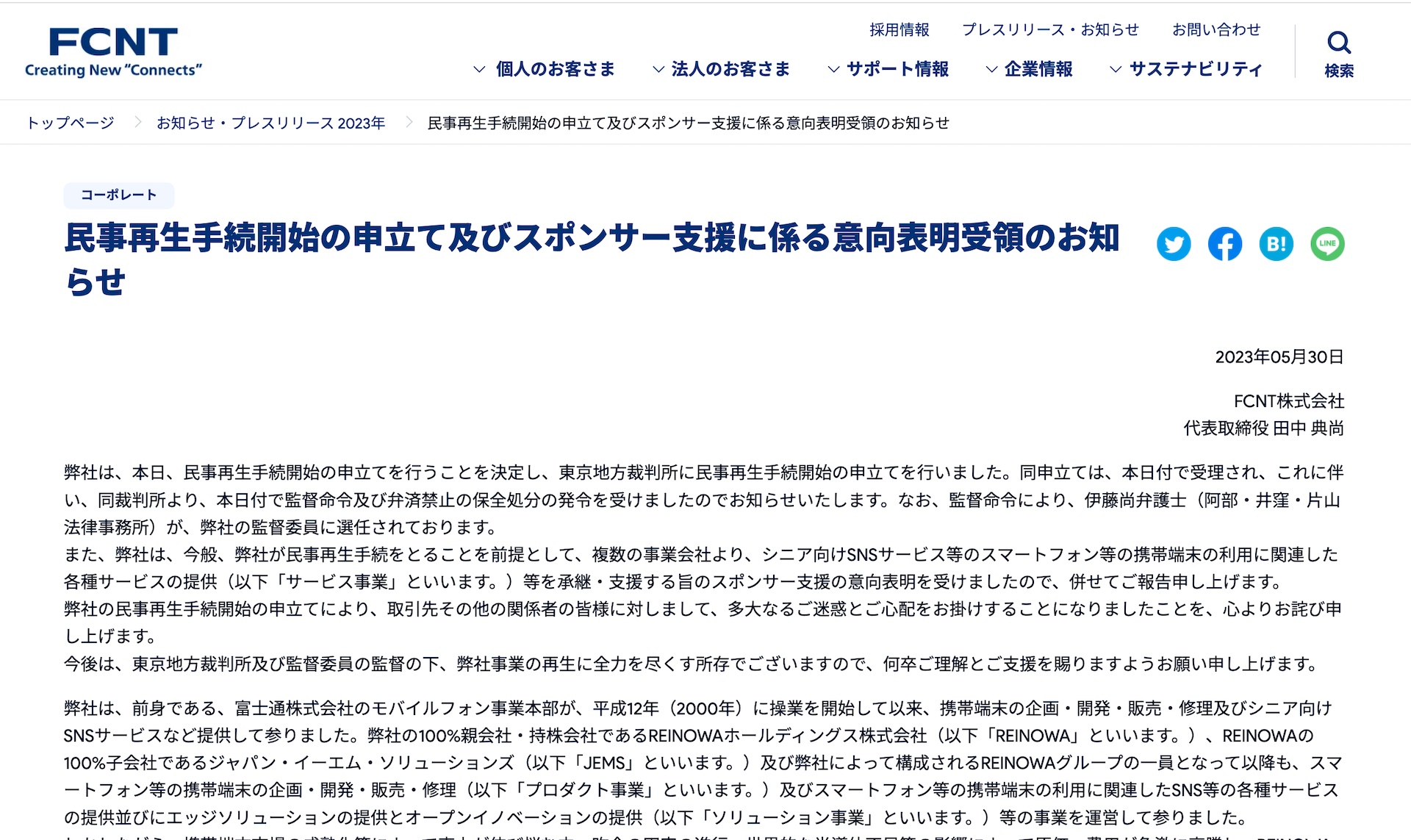 ・民事再生手続開始の申立て及びスポンサー支援に係る意向表明受領のお知らせ | FCNT株式会社
